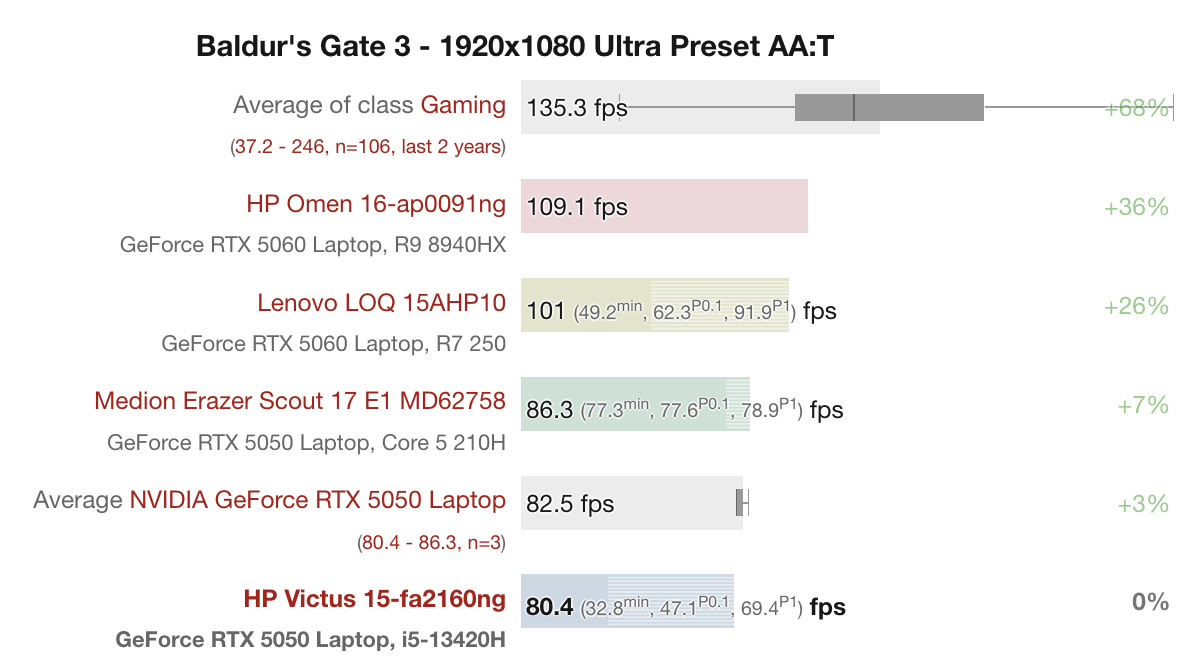 Trong Baldur's Gate 3 với thiết lập Ultra ở Full HD, HP Victus 15-fa2160ng với RTX 5050 và i5-13420H đạt trung bình 80.4 FPS (FPS tối thiểu 32.8; P0.1 = 47.1; P1 = 69.4), đúng bằng mức tham chiếu 0% của dòng RTX 5050 (82.5 FPS trung bình). So với các đối thủ cùng GPU, Medion Erazer Scout 17 E1 đạt 86.3 FPS (+7%), nhỉnh hơn một chút.