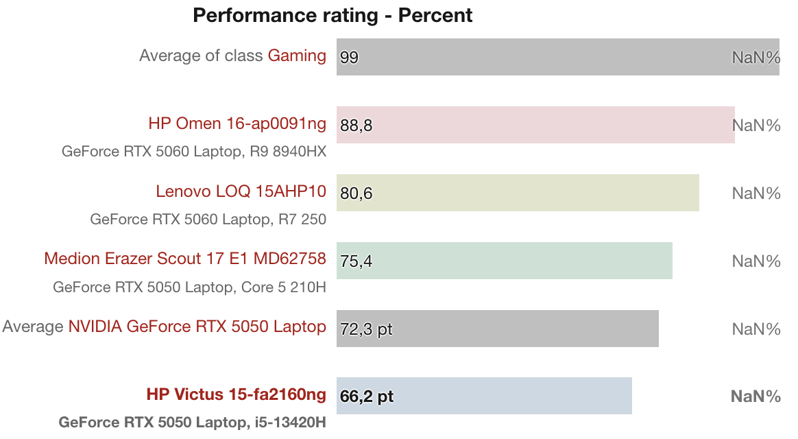 Đánh giá Performance Rating, HP Victus 15-fa2160ng với RTX 5050 và i5-13420H đạt 66.2 pt, thấp hơn mức trung bình của dòng RTX 5050 (72.3 pt). So với các đối thủ cùng GPU, Medion Erazer Scout 17 E1 đạt 75.4 pt, nhỉnh hơn một chút. Trong khi đó, các laptop RTX 5060 như HP Omen 16-ap0091ng và Lenovo LOQ 15AHP10 đạt lần lượt 88.8 pt và 80.6 pt, cho thấy hiệu năng cao hơn đáng kể. Victus 15 vẫn cung cấp trải nghiệm mượt mà trong phân khúc RTX 5050, đủ đáp ứng nhu cầu chơi game Full HD với thiết lập đồ họa cao.