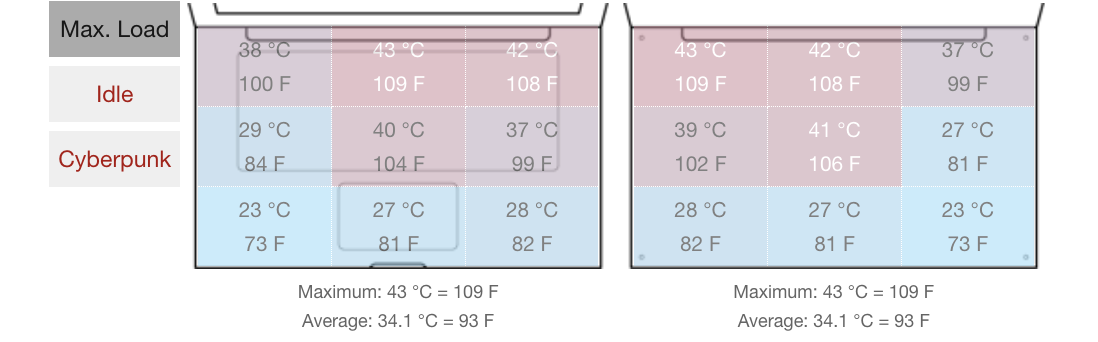 Khi máy hoạt động ở chế độ nhàn rỗi, hầu hết các khu vực đều duy trì dưới 30°C, giúp trải nghiệm sử dụng hàng ngày trở nên dễ chịu, kể cả khi đặt máy trên đùi trong thời gian dài. Điều này đảm bảo người dùng có thể làm việc, học tập hay chơi game nhẹ nhàng mà không lo bị nóng tay hay khó chịu.