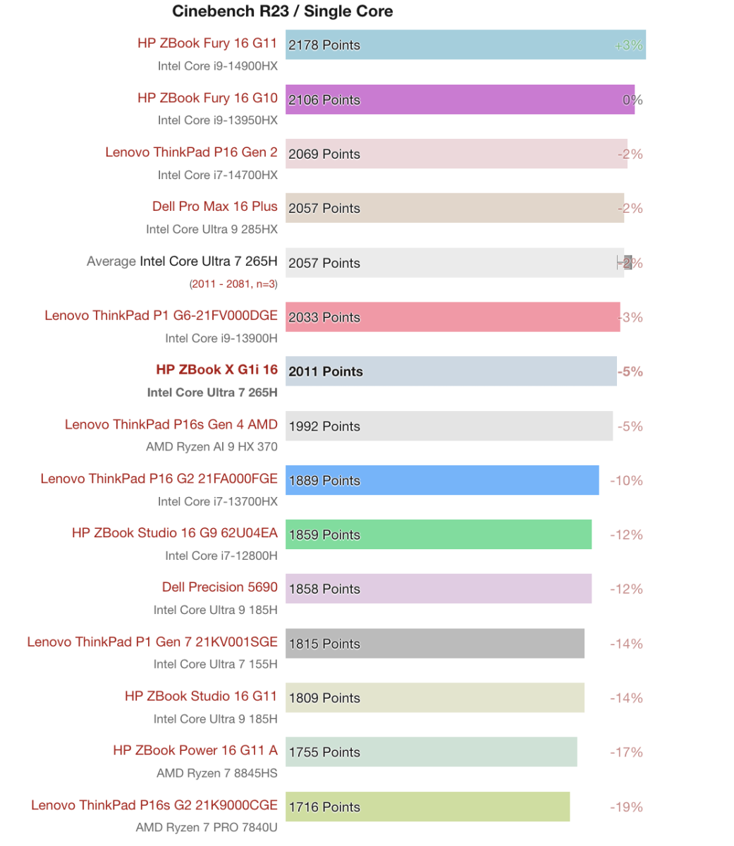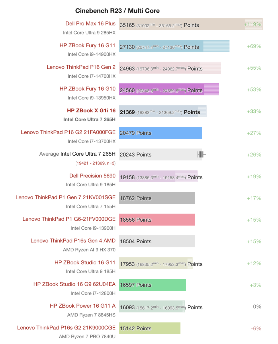 Intel Core Ultra 7 265H trên HP ZBook X G1i 16 đạt 21,369 điểm trong bài test Cinebench R23 Multi Core, nhỉnh hơn khoảng 41% so với các CPU cũ như Lenovo ThinkPad P16 G2 hay HP ZBook Studio 16 G9. Mức điểm này vẫn thấp hơn các CPU cao cấp như Core Ultra 9 285HX trên Dell Pro Max 16 Plus (35,165 điểm) hay Core i9-14900HX trên HP ZBook Fury 16 G11 (27,130 điểm), nhưng cải thiện đáng kể so với các thế hệ trước.