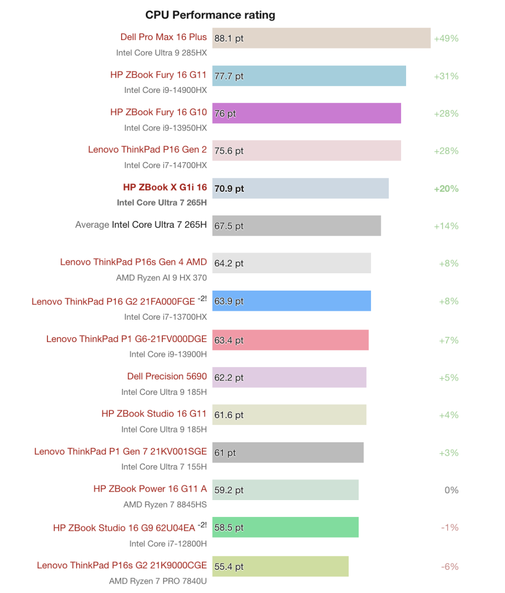 Xét theo bảng đánh giá CPU Performance, Intel Core Ultra 7 265H trên HP ZBook X G1i 16 đạt 70.9 điểm, cao hơn khoảng 20% so với các mẫu CPU cũ như Ryzen 7 8845HS hay Core Ultra 7 155H. Mức điểm này giúp máy duy trì hiệu năng ổn định, xử lý tốt các tác vụ nặng nhưng vẫn thua các CPU cao cấp hơn như Core Ultra 9 285HX hay Core i9-14900HX.