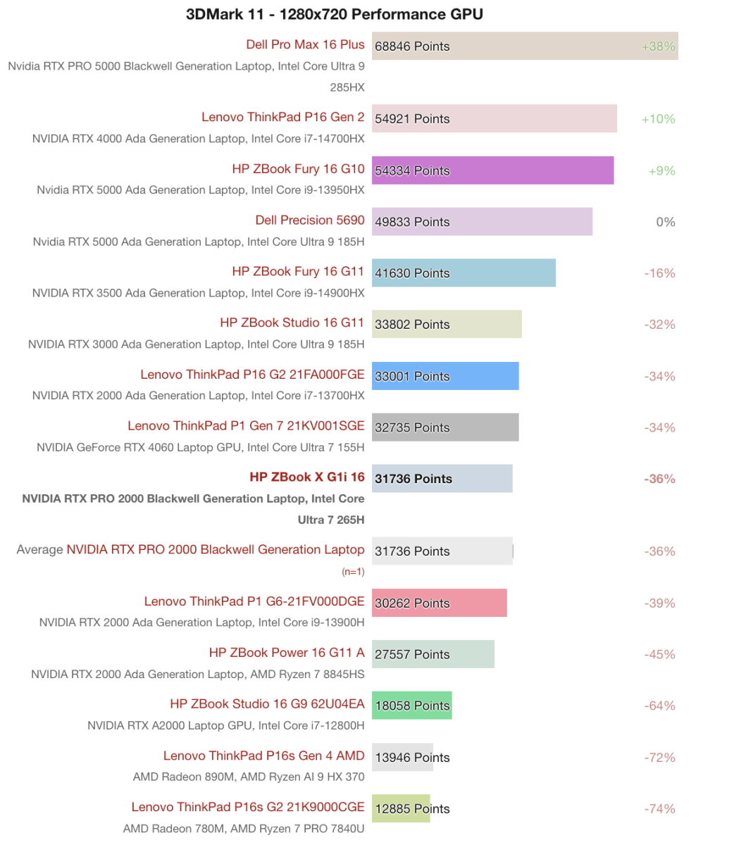 Trong bài test 3DMark 11 ở độ phân giải 1280x720, NVIDIA RTX PRO 2000 Blackwell trên HP ZBook X G1i 16 đạt 31,736 điểm, xếp sau các GPU cao cấp hơn như RTX PRO 5000 Blackwell trên Dell Pro Max 16 Plus (68,846 điểm) hay RTX 4000 Ada trên Lenovo ThinkPad P16 Gen 2 (54,921 điểm). So với các mẫu GPU cũ hơn trong phân khúc workstation, hiệu năng của RTX PRO 2000 cải thiện đáng kể, cao hơn khoảng 146% so với chuẩn tham chiếu, mang lại khả năng dựng hình 3D và xử lý đồ họa chuyên nghiệp mượt mà.