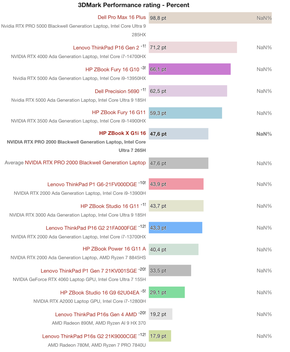 Xét theo đánh giá 3DMark Performance, RTX PRO 2000 Blackwell trên HP ZBook X G1i 16 đạt 47.6 điểm phần trăm, đưa máy vào nhóm workstation di động tầm trung. Mức điểm này thấp hơn các GPU cao cấp như RTX PRO 5000 Blackwell trên Dell Pro Max 16 Plus (98.8 điểm) hay RTX 4000 Ada trên Lenovo ThinkPad P16 Gen 2 (71.2 điểm), nhưng vẫn vượt trội so với các GPU cũ hơn hoặc ở phân khúc thấp như RTX 2000 Ada hay RTX A2000.