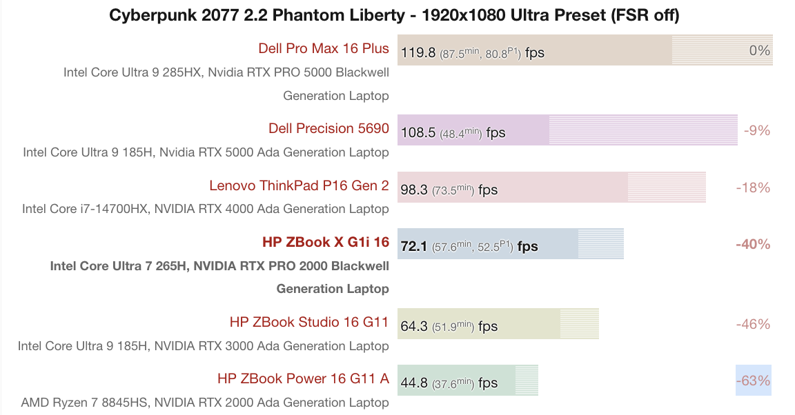 Với Cyberpunk 2077 2.2 Phantom Liberty ở thiết lập 1920x1080 Ultra (FSR tắt), HP ZBook X G1i 16 trang bị Core Ultra 7 265H và RTX PRO 2000 Blackwell đạt trung bình 72.1 FPS, với mức tối thiểu 57.6 FPS và cảnh nặng nhất 52.5 FPS. Kết quả này cho thấy máy vẫn có thể chạy mượt các tựa game AAA, mặc dù không đạt được FPS cao như các GPU cao cấp hơn, ví dụ RTX PRO 5000 Blackwell trên Dell Pro Max 16 Plus (119.8 FPS) hay RTX 5000 Ada trên Dell Precision 5690 (108.5 FPS).