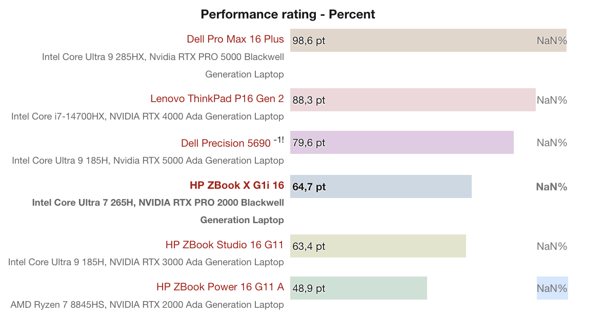 Mặc dù không bằng các GPU cao cấp như RTX PRO 5000 Blackwell trên Dell Pro Max 16 Plus (98.6%) hay RTX 4000 Ada trên Lenovo ThinkPad P16 Gen 2 (88.3%), ZBook X G1i 16 vẫn duy trì hiệu năng ổn định, cân bằng giữa sức mạnh, nhiệt độ và mức tiêu thụ năng lượng – phù hợp với người dùng cần một workstation di động đa năng, vừa đáp ứng đồ họa chuyên nghiệp vừa giải trí nhẹ.