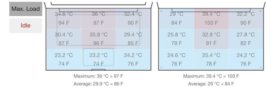 Khi hoạt động với các tác vụ nặng, nhiệt độ bề mặt HP ZBook X G1i 16 cao nhất tập trung ở khu vực trung tâm, dao động từ 29°C đến 36°C (84°F – 97°F), với nhiệt độ trung bình khoảng 29.9°C (86°F). Các khu vực khác trên máy mát hơn, từ 23°C đến 35.8°C (74°F – 96°F), đảm bảo cảm giác thoải mái khi thao tác lâu dài hoặc đặt máy trên đùi.