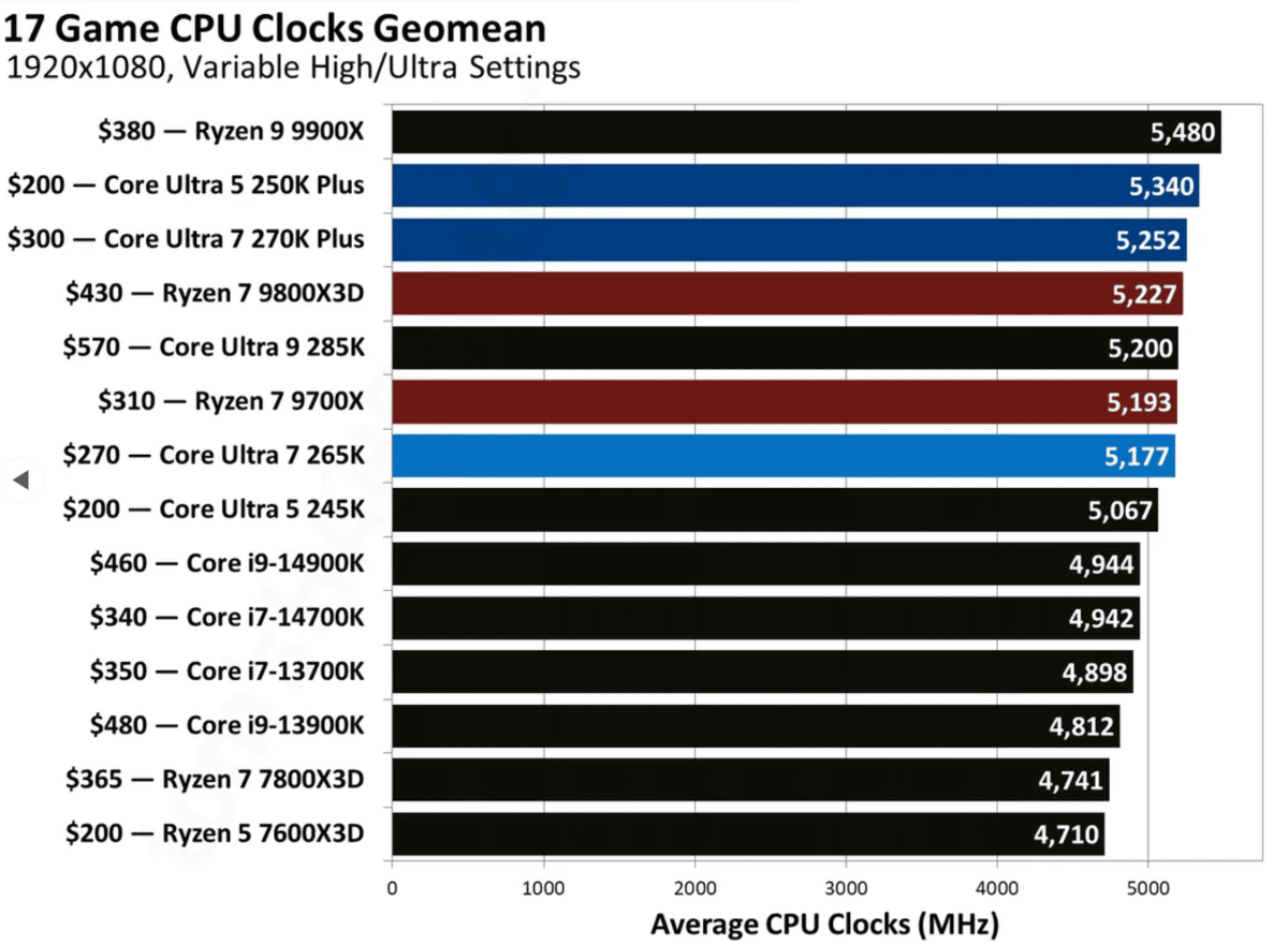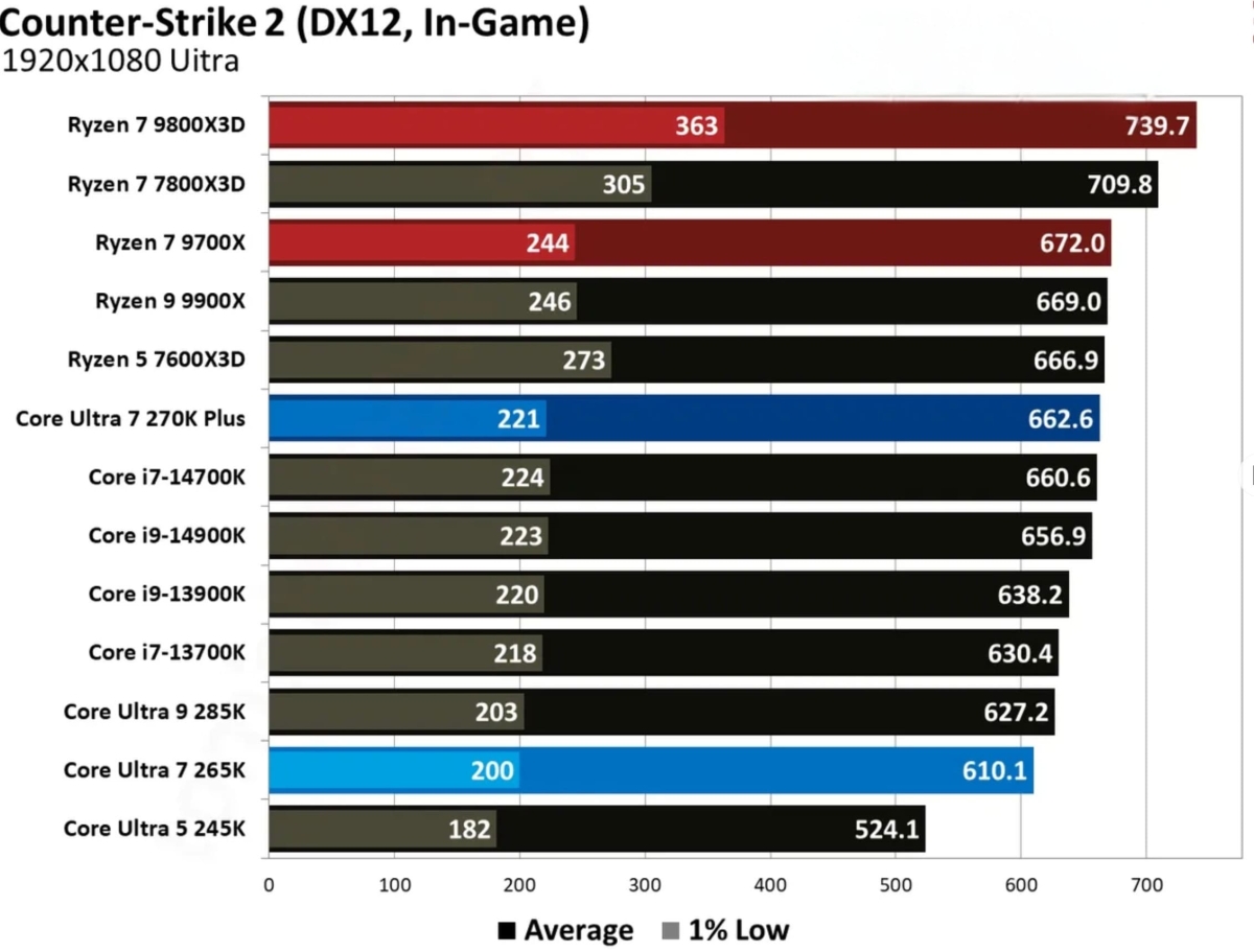 Dù vậy, các mẫu CPU AMD sử dụng bộ nhớ đệm 3D vẫn giữ lợi thế rõ rệt trong những tựa game thiên về CPU. Chẳng hạn, Ryzen 7 9800X3D và Ryzen 7 7800X3D vẫn đạt mức khung hình cao hơn đáng kể trong cùng bài thử nghiệm. Điều này cho thấy Intel Core Ultra 7 270K Plus đã cải thiện hiệu năng gaming so với thế hệ trước, nhưng vẫn chưa thể vượt qua hoàn toàn các đối thủ mạnh nhất từ AMD trong một số kịch bản.