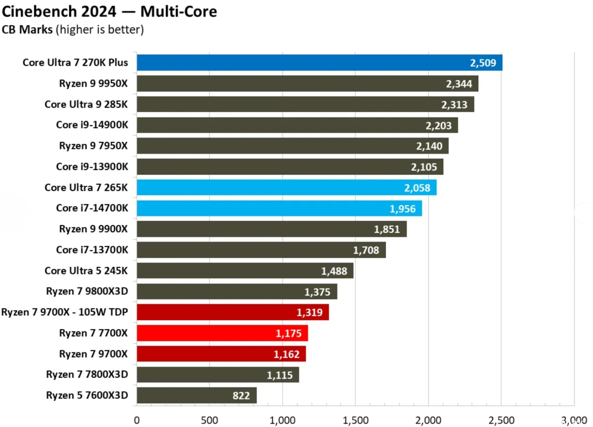Với Cinebench 2024 đa nhân, Intel Core Ultra 7 270K Plus cho thấy mức tăng hiệu năng đáng kể so với thế hệ trước. Con chip này nhanh hơn khoảng 22% so với Core Ultra 7 265K và thậm chí có thể tiệm cận hiệu năng của những CPU cao cấp hơn như Ryzen 9 9950X trong một số trường hợp. Điều này cho thấy kiến trúc Arrow Lake Plus đã mang lại cải thiện rõ rệt trong các tác vụ đa luồng.