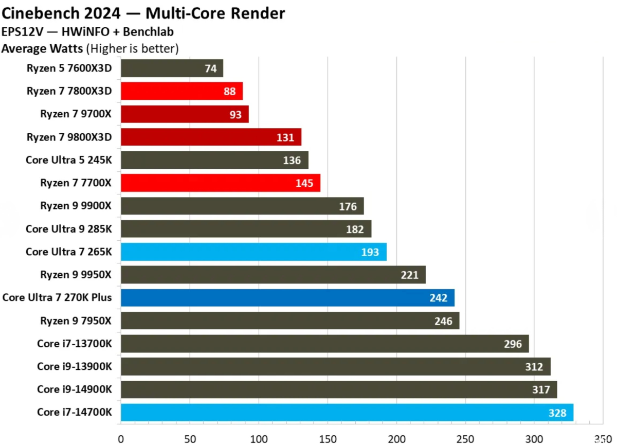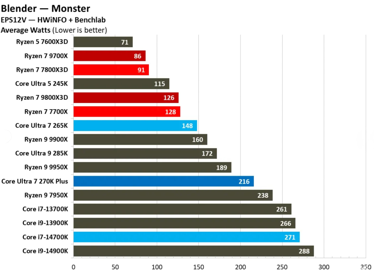 Với Blender, Core Ultra 7 270K Plus tiêu thụ khoảng 216W, cao hơn đáng kể so với 86W của Ryzen 7 9700X, tương đương mức chênh lệch khoảng 150%. Điều này cho thấy AMD vẫn có lợi thế rõ rệt về hiệu suất trên mỗi watt.