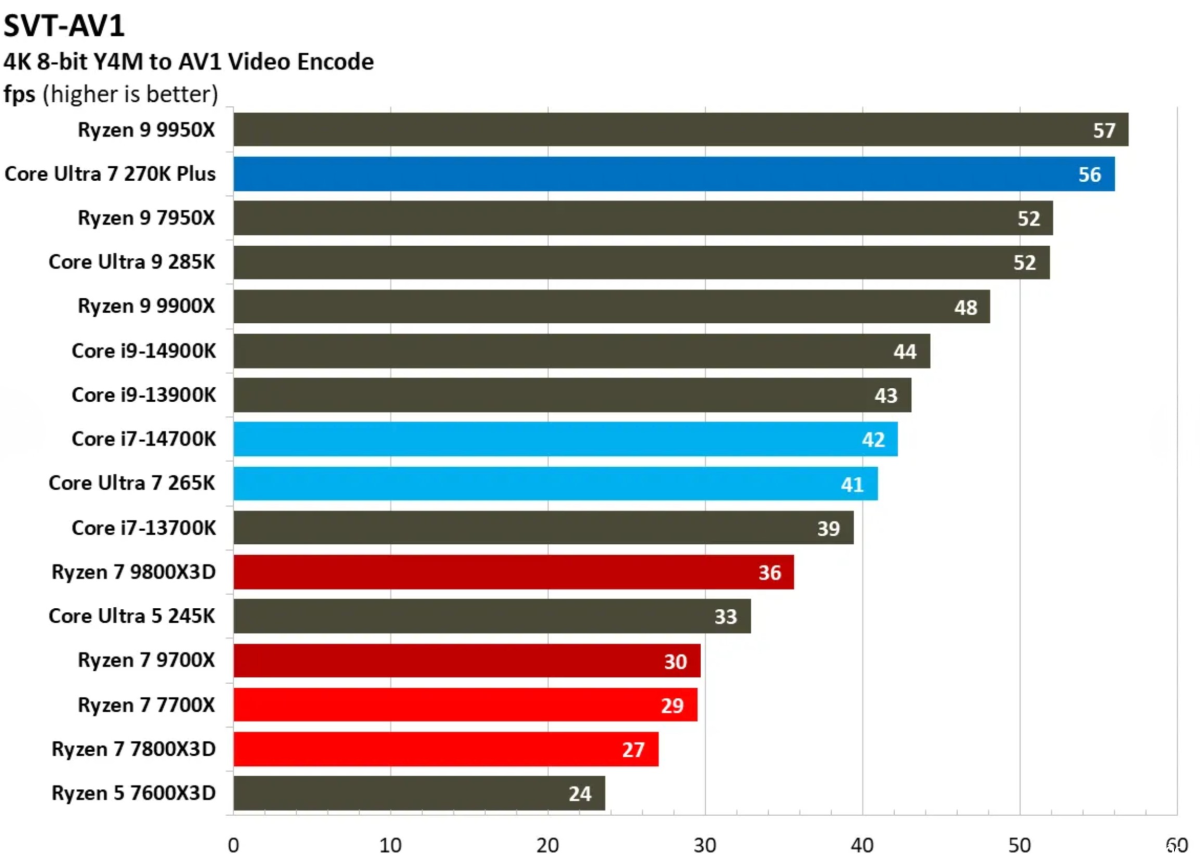 Các bài thử nghiệm encode video bằng Handbrake, Core Ultra 7 270K Plus tiếp tục thể hiện sức mạnh của cấu hình 24 nhân. Ở bài test mã hóa AV1, bộ xử lý này nhanh hơn khoảng 37% so với Core Ultra 7 265K, giúp rút ngắn đáng kể thời gian xử lý video. Nhờ đó, con chip này trở thành lựa chọn phù hợp cho những người dùng thường xuyên làm việc với video hoặc các tác vụ sáng tạo nội dung.