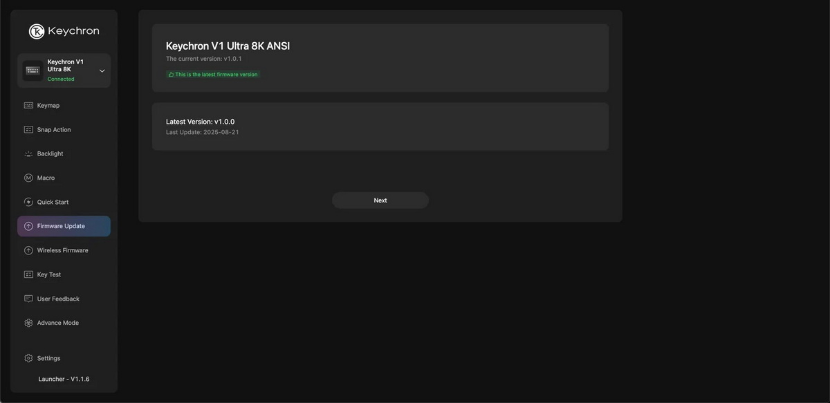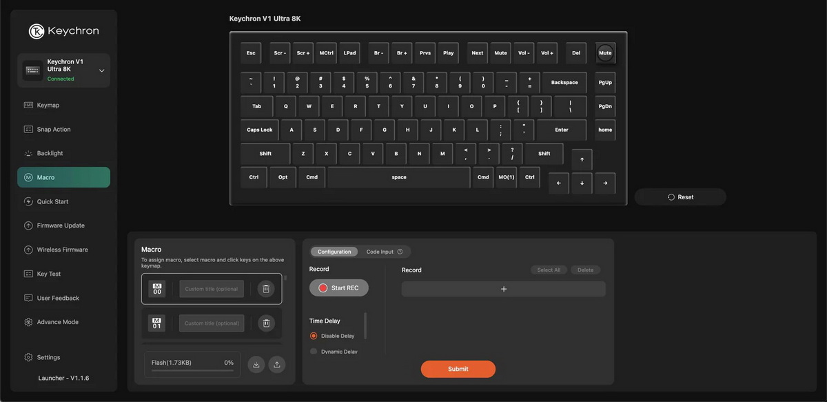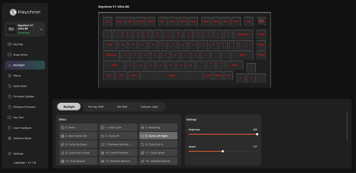 Khi được kết nối với máy tính, toàn bộ các thao tác tùy chỉnh có thể được thực hiện qua Keychron Launcher. Đây là một ứng dụng trên nền tảng web không yêu cầu cài đặt phần mềm, tương thích tốt trên cả Windows và macOS. Nó cho phép người dùng tùy chỉnh RGB với hơn 22 hiệu ứng, remap phím, lập trình macro, lưu nhiều profile vào bộ nhớ trong của bàn phím, cập nhật firmware và điều chỉnh polling rate linh hoạt.