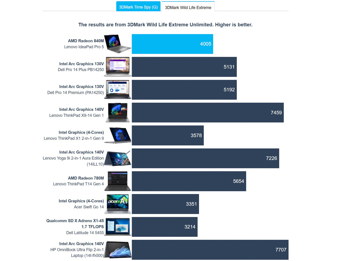 Về đồ họa, GPU tích hợp Radeon 840M đủ sức xử lý các tác vụ văn phòng và chỉnh sửa ảnh nhẹ nhàng. Tuy nhiên hiệu năng của nó không thể so sánh với các đồ họa rời hay các dòng iGPU mới nhất của Intel. Trong bài test 3DMark Time Spy, nó đạt 1914 điểm. Kết quả này cho thấy máy phù hợp hơn với các tác vụ thiên về xử lý tính toán CPU hơn là các tác vụ đồ họa nặng.