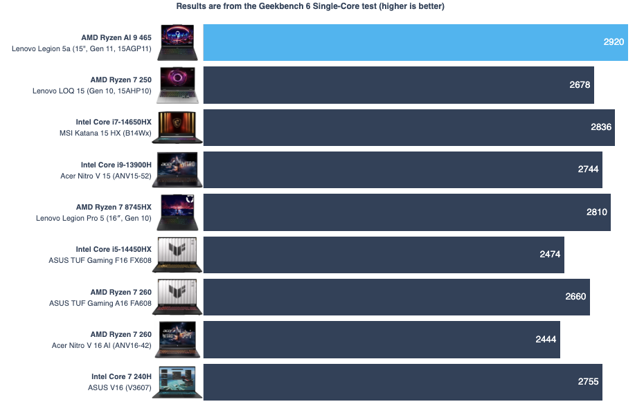 AMD Ryzen AI 9 465 trên Lenovo Legion 5a Gen 11 cho thấy hiệu năng đơn nhân khá tốt, đạt khoảng 2,920 điểm trong Geekbench 6. Mức điểm này nhỉnh hơn so với nhiều mẫu máy cùng phân khúc như Ryzen 7 250 hay Intel Core i5-14450HX, đồng thời tiệm cận các CPU hiệu năng cao hơn như Core i7-14650HX.