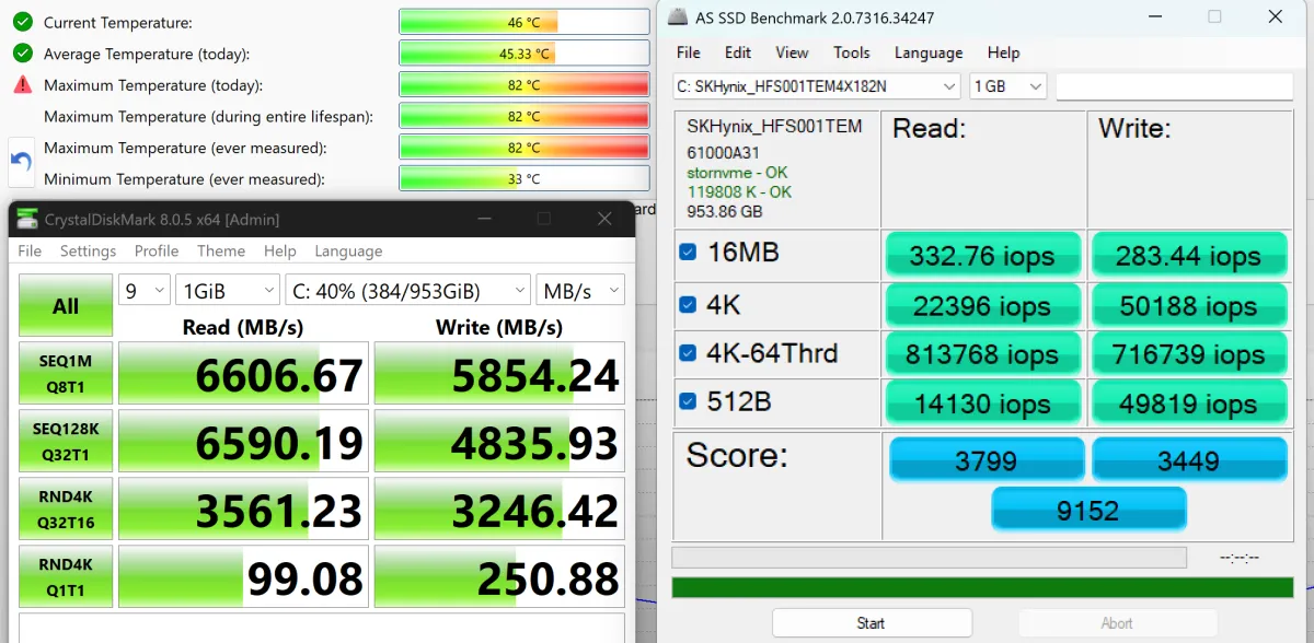 Trong AS SSD, ổ cứng đạt tổng điểm khoảng 9,152 với hiệu năng IOPS cao ở cả đọc và ghi, đặc biệt ở các tác vụ đa luồng. Điều này giúp cải thiện rõ rệt tốc độ khởi động hệ thống, mở ứng dụng và tải game, mang lại trải nghiệm sử dụng mượt mà trong thực tế.
