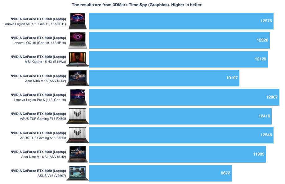 NVIDIA GeForce RTX 5060 trên Lenovo Legion 5a Gen 11 đạt khoảng 12,575 điểm trong 3DMark Time Spy (Graphics), nằm trong nhóm cao của các mẫu laptop cùng GPU. Mức điểm này tương đương hoặc nhỉnh hơn nhiều đối thủ như LOQ 15, ASUS TUF hay MSI Katana, cho thấy hiệu năng được tối ưu khá tốt.