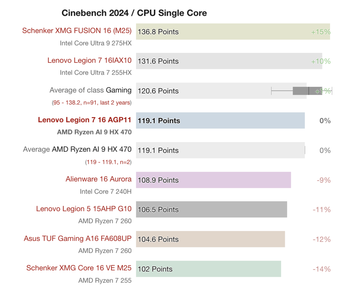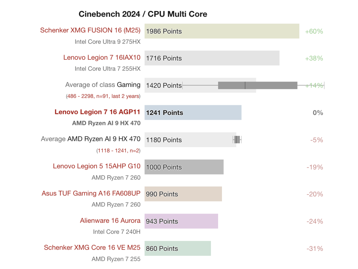 Lenovo Legion 7 16 AGP11 với AMD Ryzen AI 9 HX 470 cho hiệu năng đa nhân khá tốt trong phân khúc, đạt 1,241 điểm Cinebench 2024 Multi Core, cho thấy khả năng xử lý ổn định các tác vụ nặng như render, encode video hay làm việc đa nhiệm. Dù không dẫn đầu tuyệt đối so với các CPU Intel Core Ultra 9, nhưng mức hiệu năng này vẫn đảm bảo trải nghiệm mượt mà trong hầu hết nhu cầu thực tế.