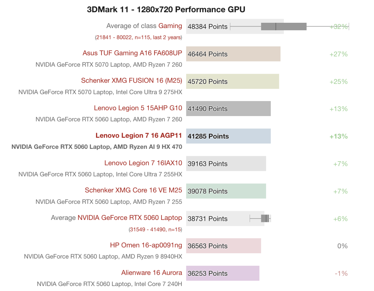Lenovo Legion 7 16 AGP11 sử dụng NVIDIA GeForce RTX 5060 Laptop 8GB, đạt 41,285 điểm trong bài test 3DMark 11 (1280 x 720 Performance GPU). Kết quả cho thấy GPU duy trì hiệu năng đúng chuẩn phân khúc, nằm sát mức trung bình của RTX 5060 Laptop và đảm bảo độ ổn định khi so sánh với các hệ thống tương đương.