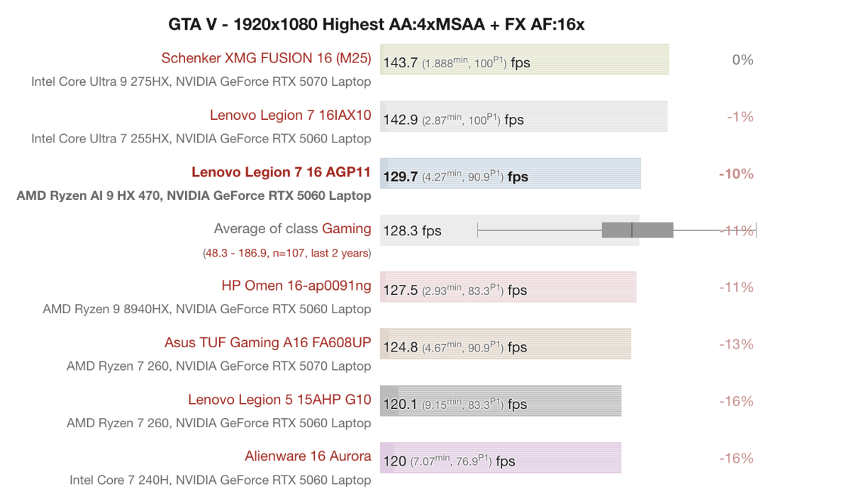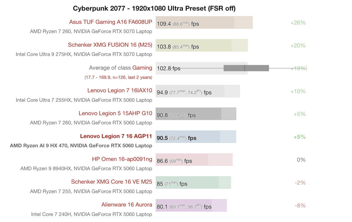 Lenovo Legion 7 16 AGP11 với Ryzen AI 9 HX 470 và RTX 5060 Laptop cho hiệu năng chơi game khá ổn định trong nhóm cấu hình tầm cao. Ở Cyberpunk 2077 (1080p Ultra, FSR off), máy đạt 90.5 FPS trung bình, cho thấy khả năng xử lý tốt các tựa game nặng với thiết lập đồ họa cao mà vẫn giữ được độ ổn định khung hình.
