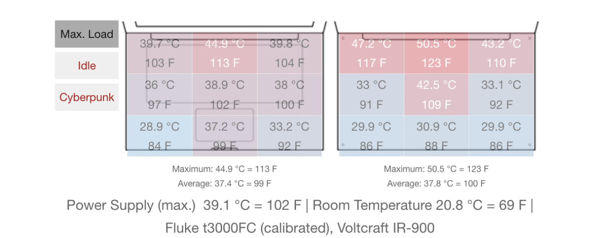 Khi đẩy tải nặng như Cyberpunk 2077 hoặc stress test, nhiệt độ CPU/GPU tăng lên nhưng vẫn được kiểm soát trong khoảng khoảng 39.7–44.9°C ở mức trung bình và tối đa ghi nhận khoảng 50.5°C. Đây là mức nhiệt khá tốt đối với một laptop gaming mỏng nhẹ, cho thấy khả năng tản nhiệt của Legion 7 16 AGP11 đủ sức giữ hiệu năng ổn định trong thời gian dài.