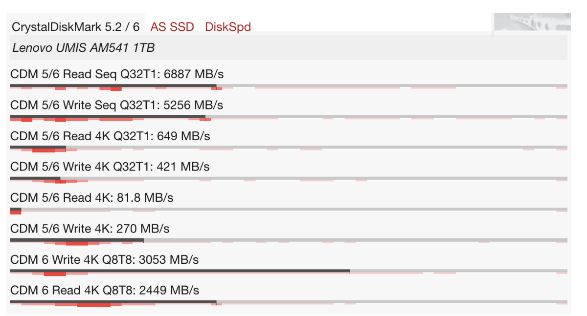 Lenovo Legion 7 16 AGP11 được trang bị SSD Lenovo UMIS AM541 dung lượng 1TB, cho hiệu năng đọc/ghi tuần tự rất ấn tượng trong bài test CrystalDiskMark 5.2/6 với 6,887 MB/s đọc và 5,256 MB/s ghi. Đây là mức tốc độ cao trong phân khúc, giúp rút ngắn đáng kể thời gian khởi động hệ điều hành, mở ứng dụng và sao chép dữ liệu dung lượng lớn.