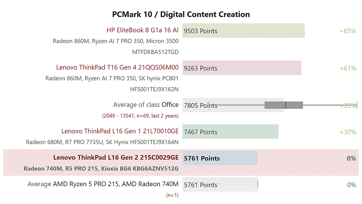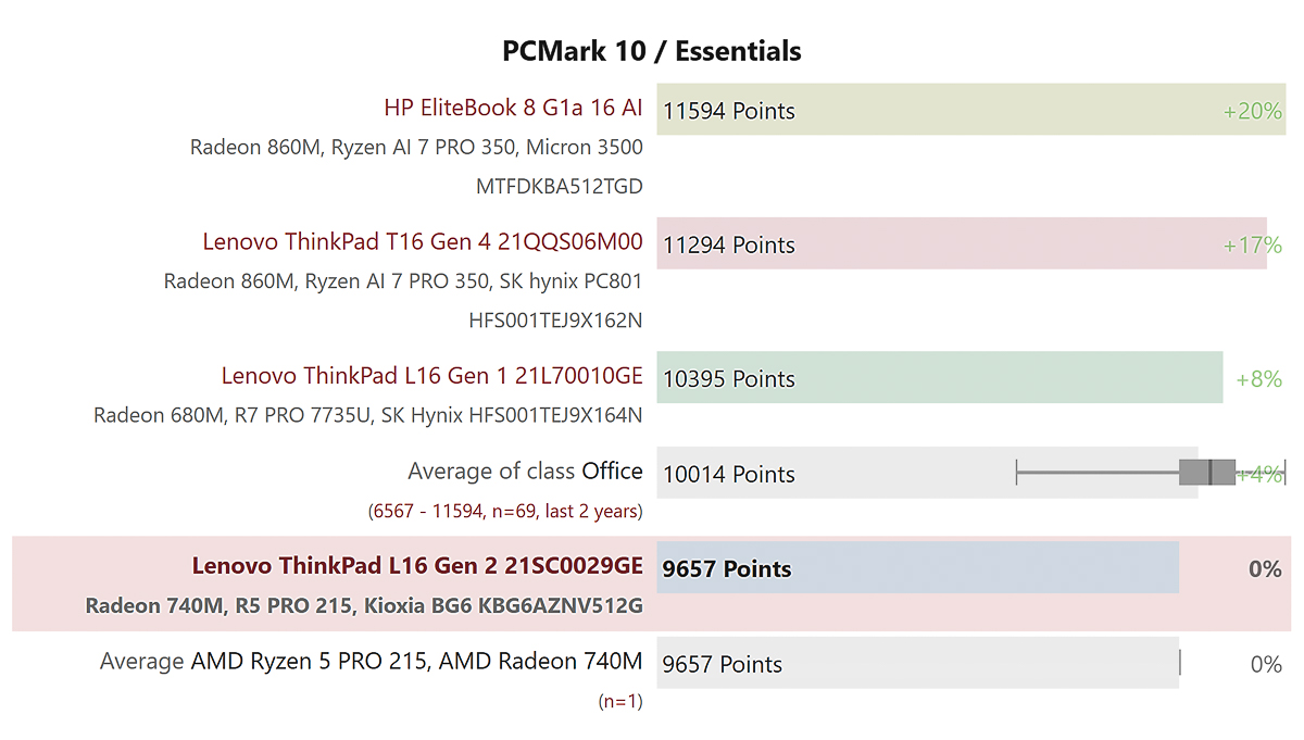 Benchmark với phần mềm PCMark10 để đánh giá chung khả năng xử lý các loại tác vụ văn phòng. Điểm tổng Lenovo ThinkPad L16 Gen 2 cho ra là 5,756 - ngưỡng hiệu suất trung bình cao trong thế giới Ultrabook. Tuy nhiên lại bị AMD Ryzen 7 Pro 7735U vượt mặt 10%, và vi xử lý AMD AI mới vượt mặt lần lượt là 27% và 32% trên 2 mẫu laptop HP EliteBook và ThinkPad T16 Gen 4.