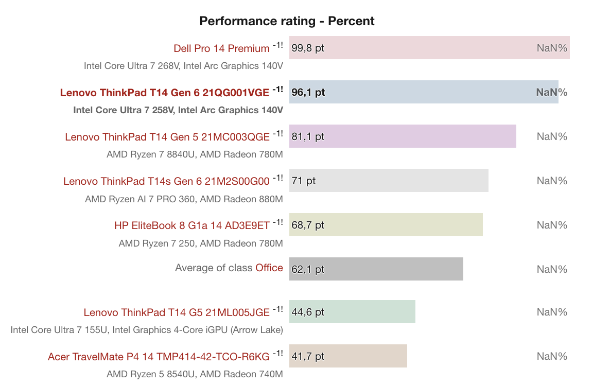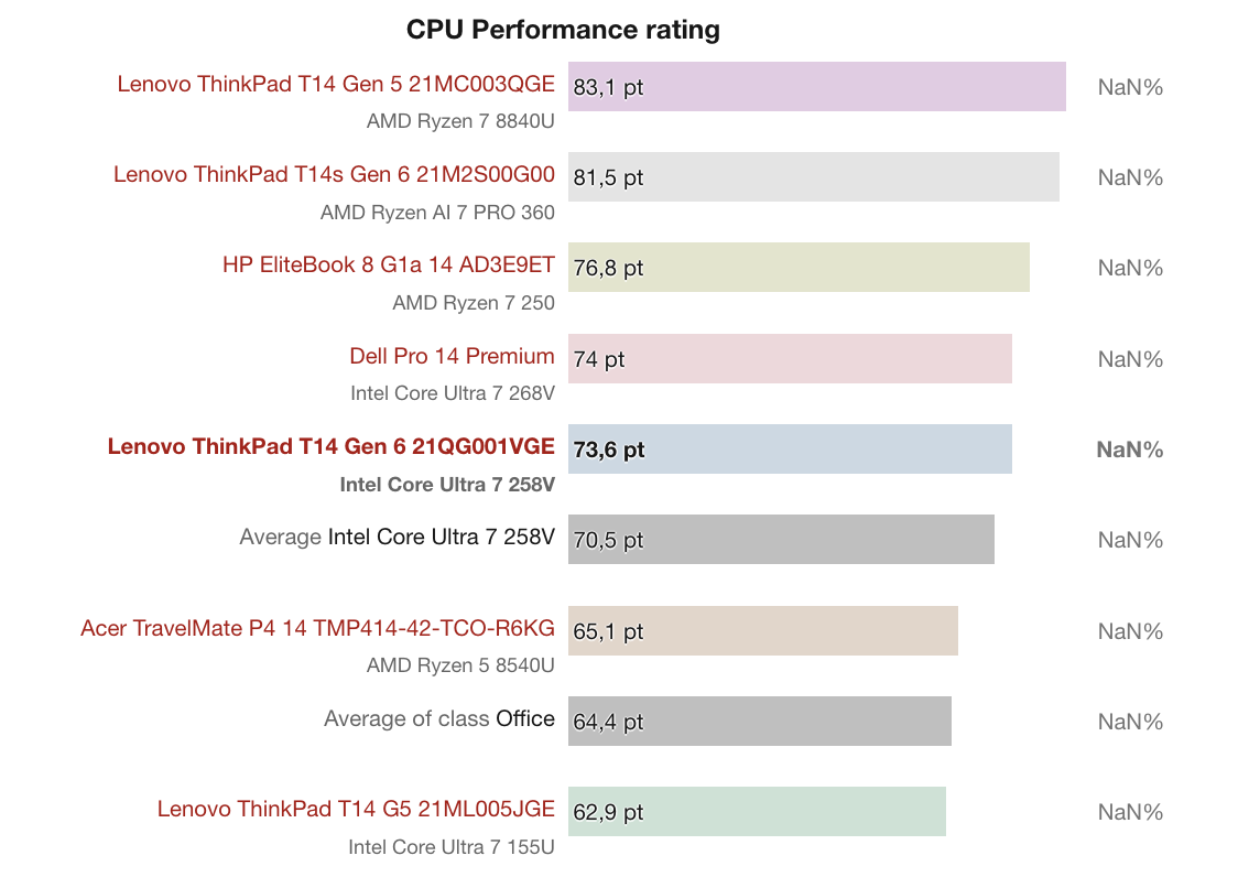 Hiệu năng CPU của Lenovo ThinkPad T14 Gen 6 với Intel Core Ultra 7 258V đạt 73.6 điểm, cao hơn mức trung bình của dòng Intel Core Ultra 7 (70.5 điểm) và thuộc nhóm trên so với các laptop văn phòng thông thường (64.4 điểm). Tuy nhiên, so với các mẫu ThinkPad chạy AMD như T14 Gen 5 với Ryzen 7 8840U (83.1 điểm) hay T14s Gen 6 với Ryzen AI 7 PRO 360 (81.5 điểm), CPU Intel vẫn kém hơn về tổng thể hiệu năng.