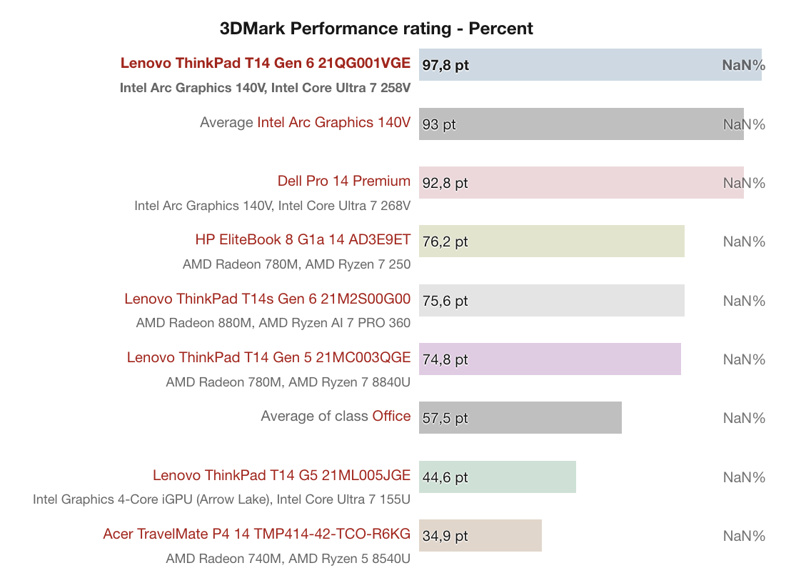 So với mức trung bình của các laptop văn phòng (62.1 điểm), hiệu năng Arc 140V trên T14 Gen 6 nổi bật rõ rệt, khẳng định đây là lựa chọn mạnh mẽ trong phân khúc laptop doanh nghiệp nếu bạn muốn có thêm khả năng giải trí nhẹ sau giờ làm việc.