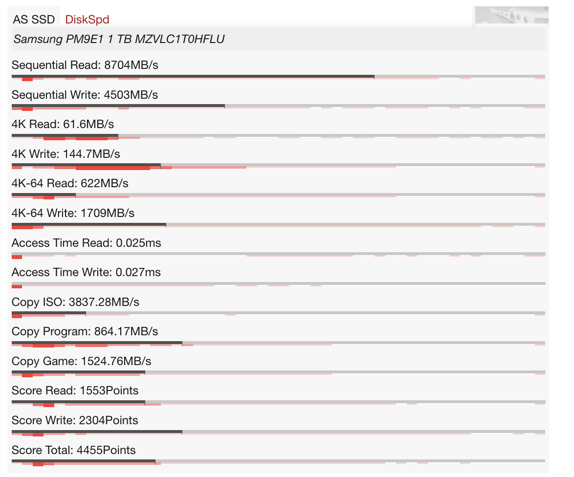 Lenovo ThinkPad T14 Gen 6 trang bị SSD NVMe PCIe 5.0 Samsung PM9E1 1 TB, mang lại tốc độ đọc tuần tự lên đến 8,704 MB/s và ghi tuần tự 4,503 MB/s. Các phép đo 4K và 4K-64 cũng cho thấy hiệu năng rất tốt, giúp việc mở ứng dụng, sao chép dữ liệu hay tải game diễn ra gần như tức thì.