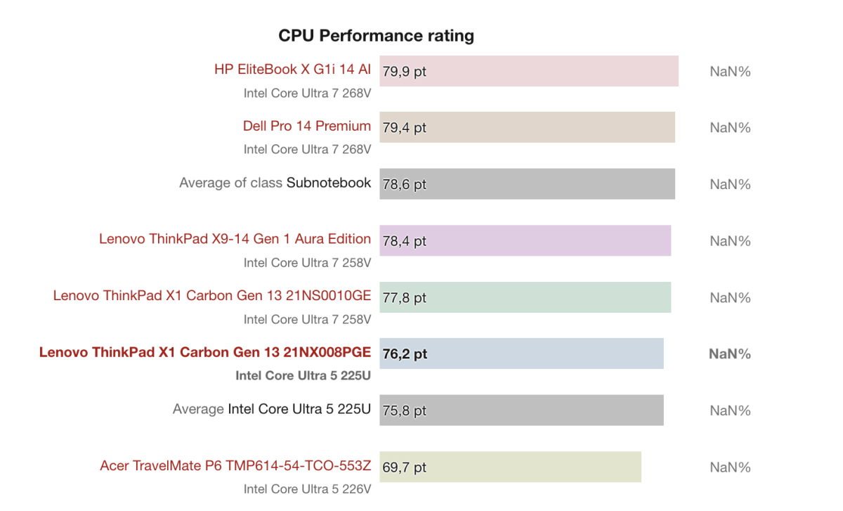 Dựa trên bảng xếp hạng hiệu năng CPU, Lenovo ThinkPad X1 Carbon Gen 13 sử dụng Intel Core Ultra 5 225U đạt mức điểm 76.2, thấp hơn một chút so với các mẫu trang bị Core Ultra 7 như EliteBook X G1i 14 AI hay Dell Pro 14 Premium, nhưng vẫn tiệm cận mức trung bình của nhóm laptop mỏng nhẹ.