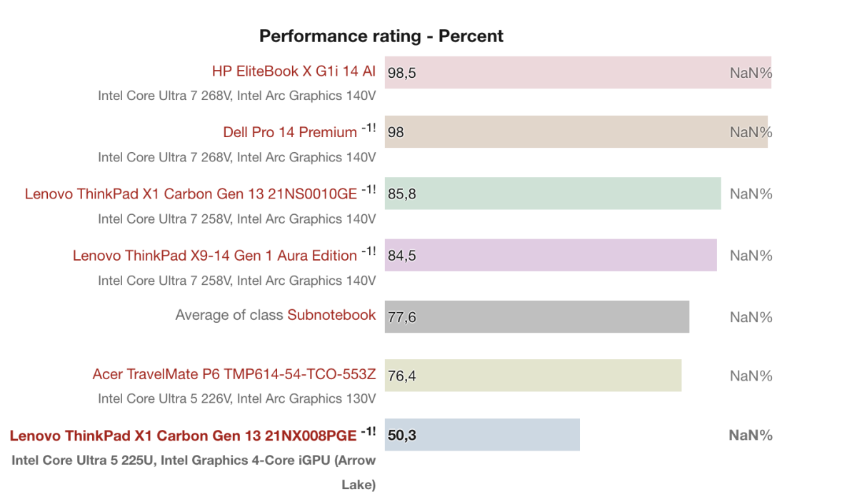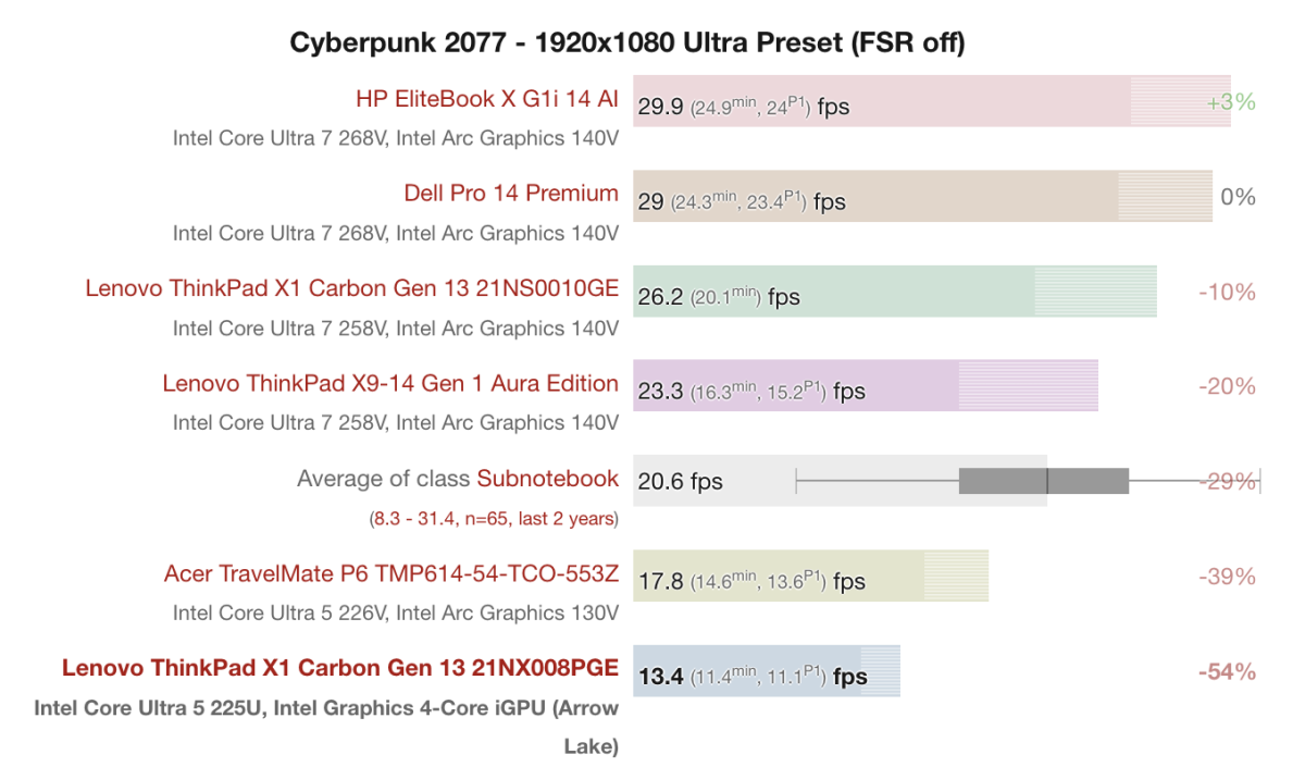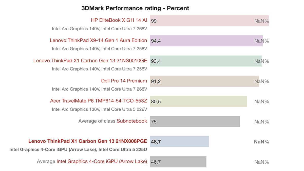 Dựa trên bảng xếp hạng 3DMark, Lenovo ThinkPad X1 Carbon Gen 13 với iGPU Intel Graphics 4-Core (Arrow Lake) đạt mức hiệu năng thấp hơn đáng kể so với các mẫu dùng Intel Arc Graphics 140V trên Core Ultra 7. Điểm số chỉ ở mức 48.7%, cao hơn nhẹ so với trung bình của chính dòng iGPU Arrow Lake nhưng cách khá xa mặt bằng chung của nhóm subnotebook, vốn đạt khoảng 75%.