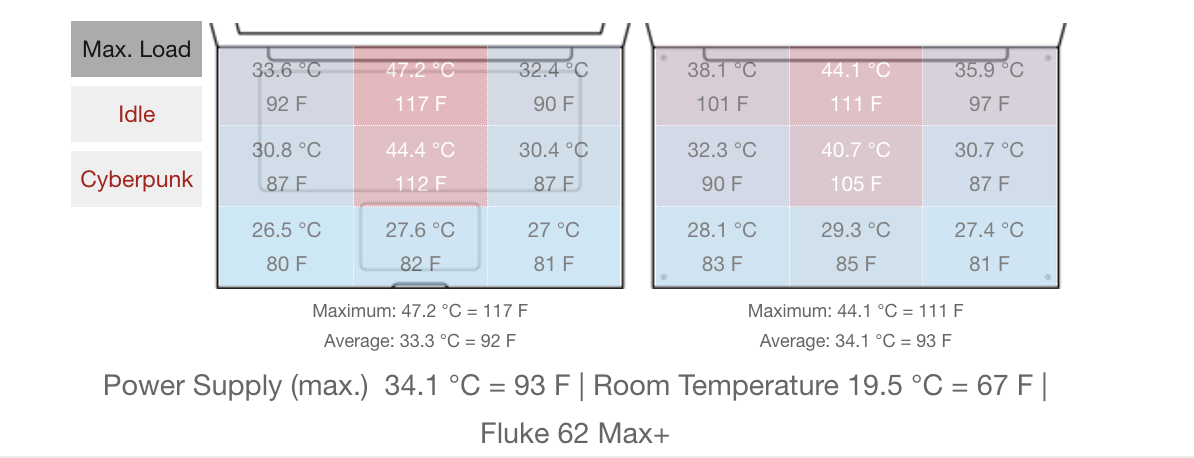 Trong các bài stress test nặng (Prime95 + FurMark), Lenovo ThinkPad X1 Carbon Gen 13 phiên bản Arrow Lake-U cho thấy mức nhiệt cao hơn rõ rệt so với biến thể Lunar Lake. Nhiệt độ đo trên khu vực bàn phím có thể lên tới 47.2°C, cao hơn gần 5°C so với phiên bản còn lại, đủ để người dùng cảm nhận rõ độ ấm khi đặt tay lâu trong điều kiện tải nặng liên tục.