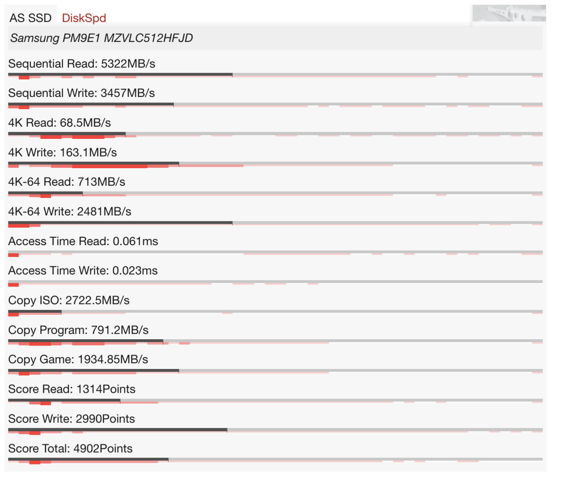 Trong các bài test copy, SSD này duy trì tốc độ ổn định, mang lại trải nghiệm sử dụng nhanh và liền mạch. Tổng điểm AS SSD đạt 4,902 điểm, phản ánh đúng vai trò của SSD trên X1 Carbon Gen 13: ưu tiên sự ổn định và cảm giác mượt trong công việc hằng ngày hơn là chạy theo con số.