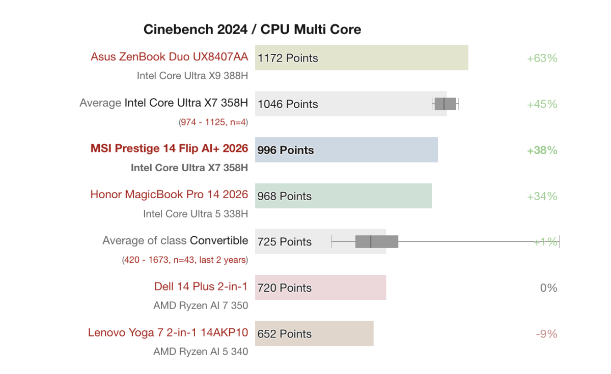 MSI Prestige 14 Flip AI+ được trang bị vi xử lý Intel Core Ultra X7 358H thuộc dòng Panther Lake, hướng đến các mẫu laptop mỏng nhẹ nhưng vẫn đảm bảo hiệu năng cho công việc và đa nhiệm. Trong các bài kiểm tra hiệu năng, con chip này cho thấy khả năng xử lý khá tốt so với nhiều mẫu laptop cùng phân khúc.