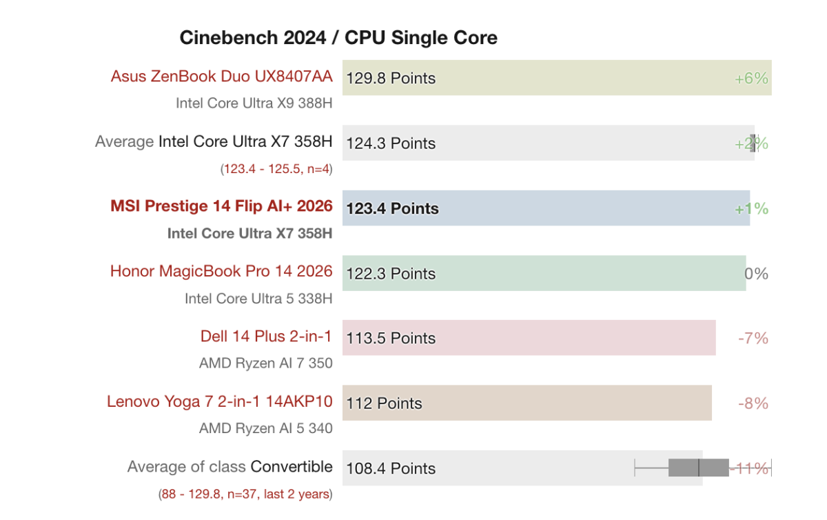 Trong khi đó, ở bài kiểm tra Cinebench 2024 đơn nhân, MSI Prestige 14 Flip AI+ đạt khoảng 123.4 điểm, gần tương đương với mức trung bình của các hệ thống sử dụng cùng vi xử lý. Điều này cho thấy hiệu năng đơn nhân của máy vẫn khá ổn định, đảm bảo trải nghiệm mượt mà trong các tác vụ hằng ngày.