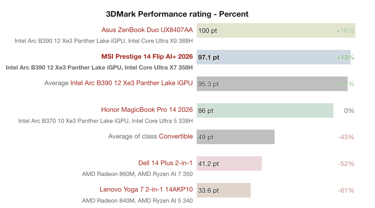 MSI Prestige 14 Flip AI+ sử dụng đồ họa tích hợp Intel Arc B390 thuộc kiến trúc Xe3 của Panther Lake. Trong bài kiểm tra 3DMark, hệ thống đạt khoảng 97.1 điểm, cao hơn mức trung bình của nhiều mẫu laptop convertible trong cùng phân khúc.