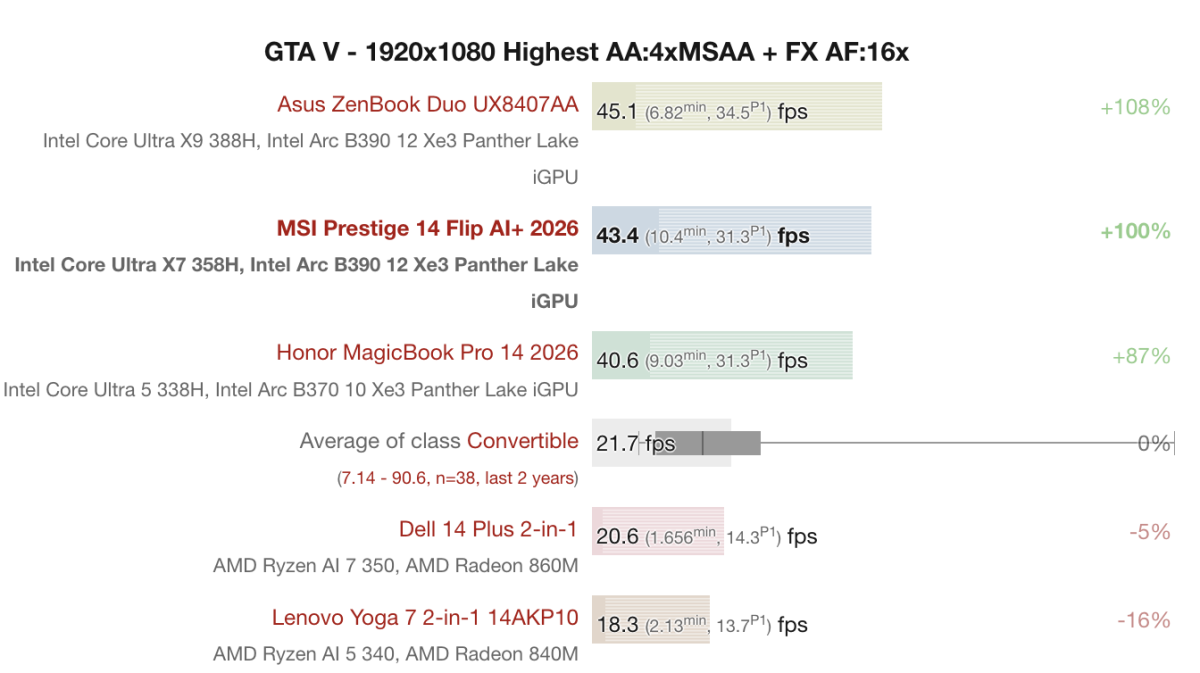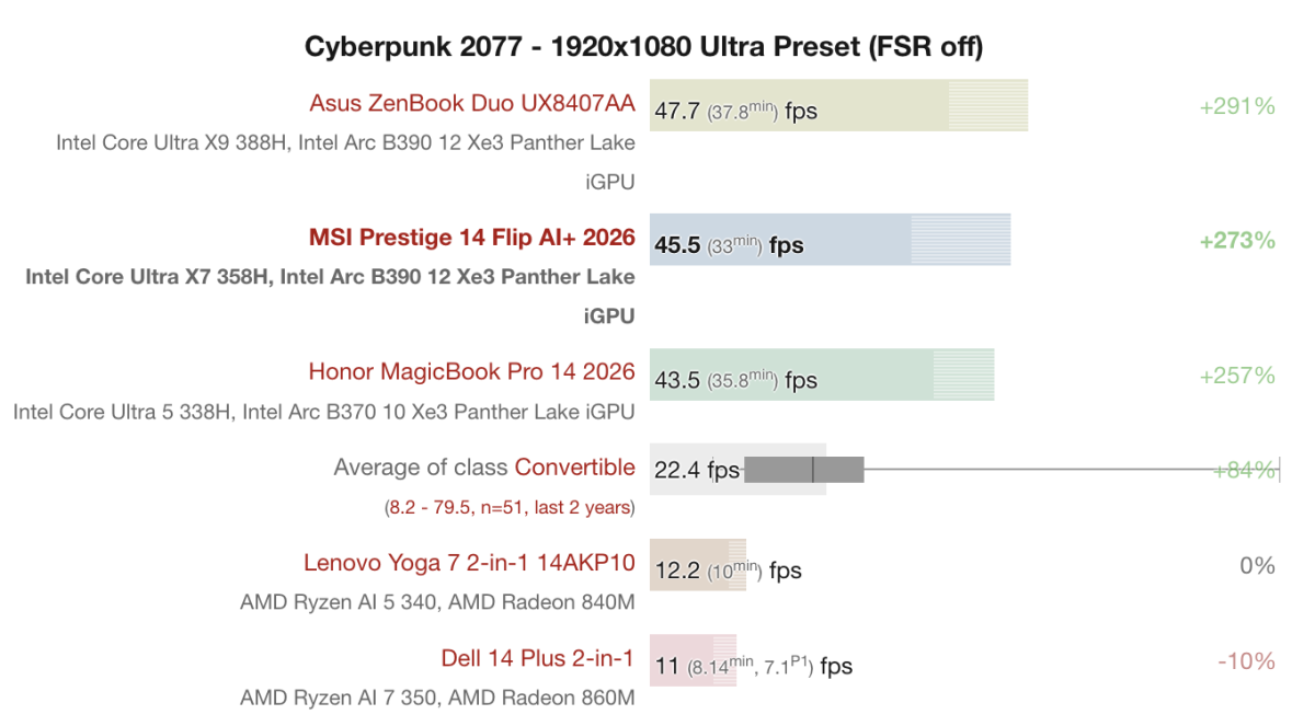 Dù không phải là mẫu laptop chuyên game, MSI Prestige 14 Flip AI+ vẫn cho thấy khả năng xử lý đồ họa khá ổn nhờ GPU tích hợp Intel Arc B390. Trong bài test với tựa game Cyberpunk 2077 ở độ phân giải 1920 x 1080, máy đạt khoảng 45.5FPS, cao hơn đáng kể so với mức trung bình của nhiều mẫu laptop 2 trong 1 trong cùng phân khúc.