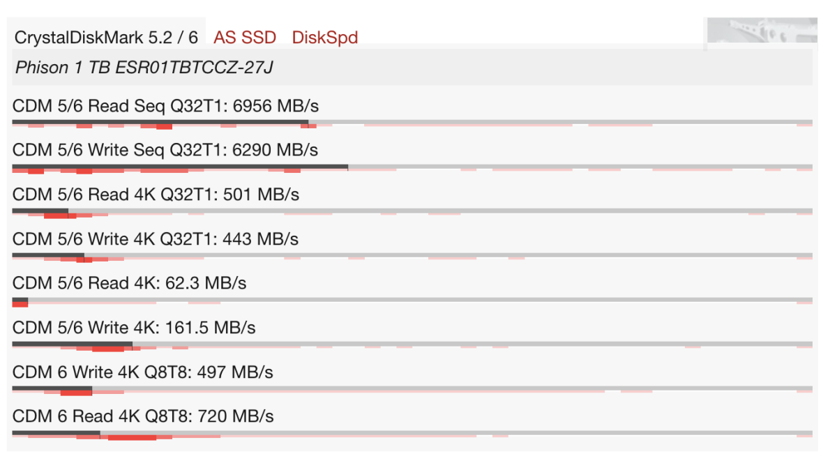 MSI Prestige 14 Flip AI+ được trang bị SSD 1TB chuẩn PCIe 4.0 từ Phison, mang lại tốc độ truyền dữ liệu khá ấn tượng trong quá trình thử nghiệm. Cụ thể, trong bài test CrystalDiskMark, ổ cứng đạt khoảng 6,956MB/s tốc độ đọc tuần tự và 6,290MB/s tốc độ ghi, cho thấy khả năng truy xuất dữ liệu rất nhanh.