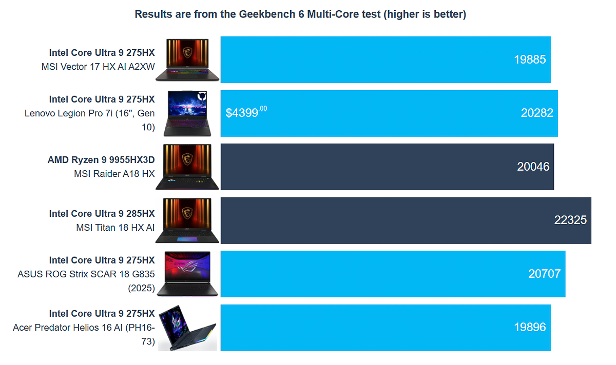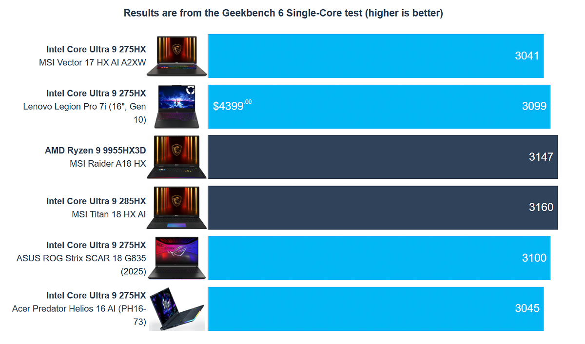 Đo lường hiệu suất bằng phần mềm Geekbench 6, có thể thấy Intel Core Ultra 9 275HX dù được tối ưu hiệu năng rất tốt nhờ vào khả năng tản nhiệt ưu việt. Nhưng nhìn chung là cả 2 mục hiệu năng đơn nhân và đa nhân đều bị các đối thủ vượt mặt đôi chút. Về mặt CPU, thì dường như đàn anh MSI Titan 18 HX AI trang bị Intel Core Ultra 9 285HX là có hiệu năng nhỉnh hơn khá nhiều MSI Vector 17 HX AI A2XW lẫn các đối thủ.