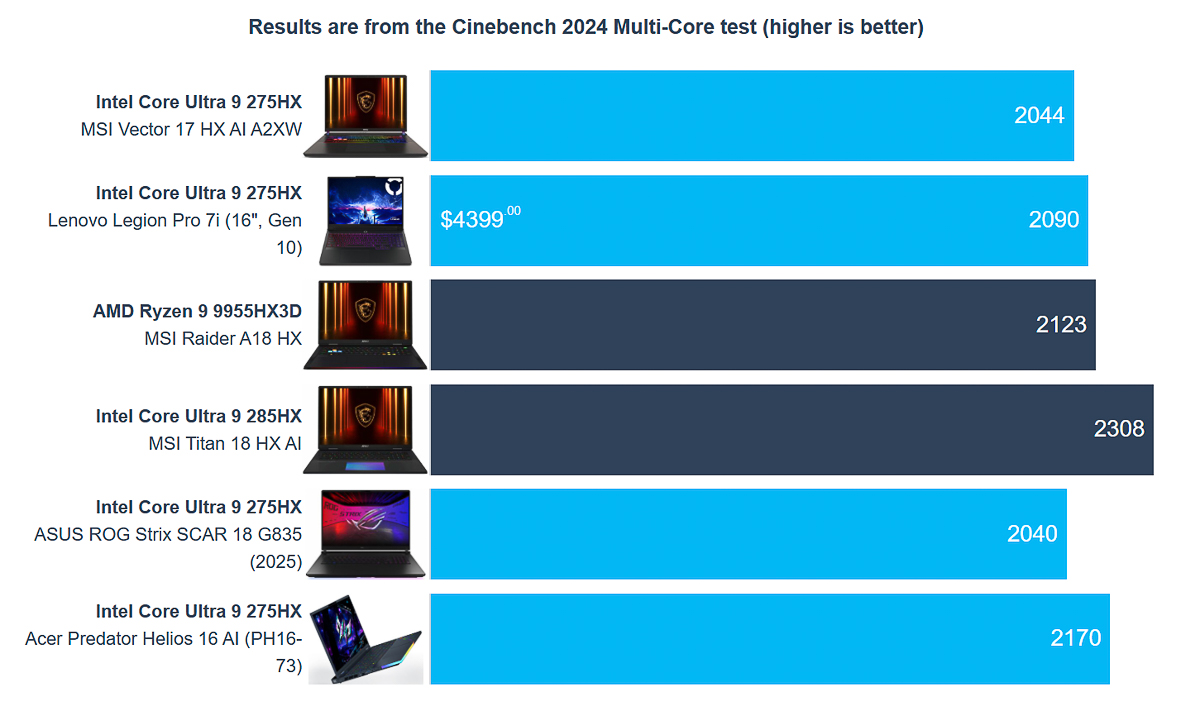 Thử nghiệm hiệu năng dựng đồ họa 3D của Intel Core Ultra 9 275HX với phần mềm Cinebench R24, kết quả cũng tương tự. MSI Vector 17 HX AI A2XW bị các đối thủ vượt mặt không quá nhiều, nhưng một lần nữa đàn anh MSI Titan 18 HX AI lại chiếm ưu thế với Intel Core Ultra 9 285HX.