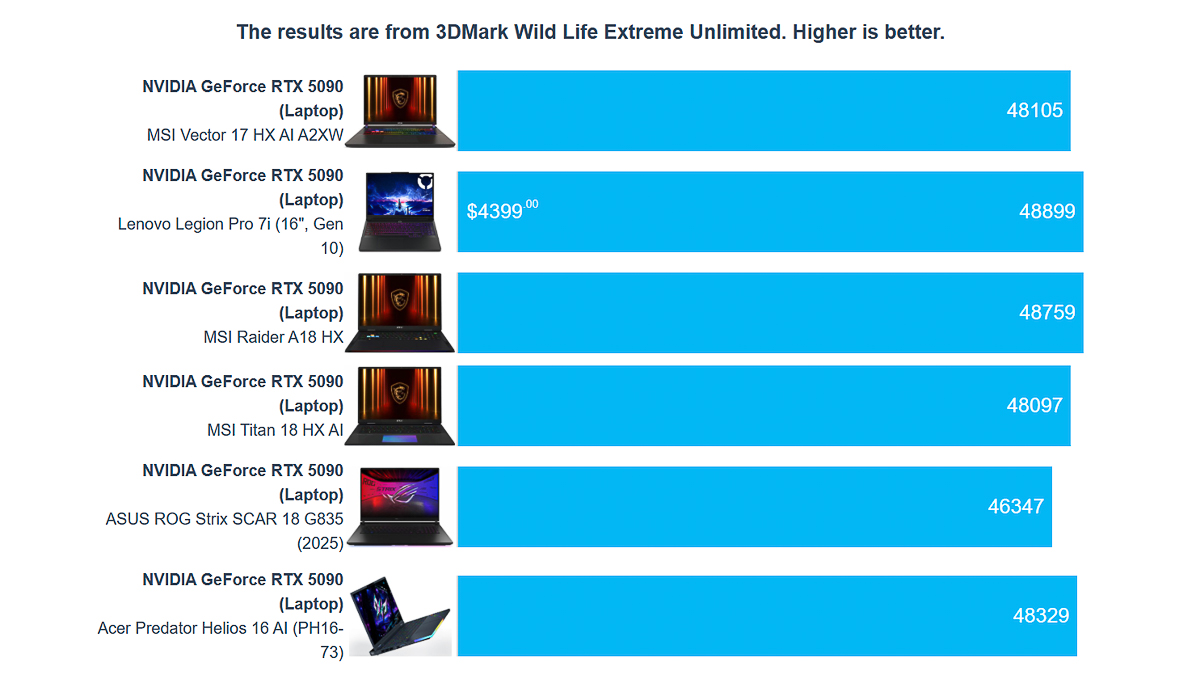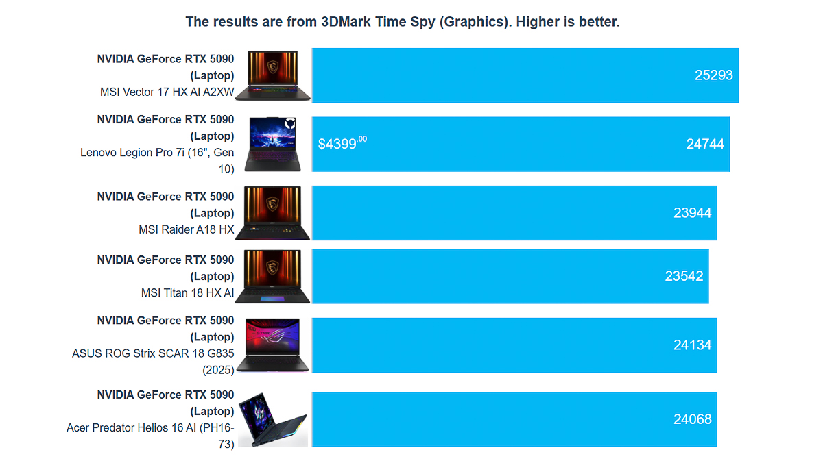 So với các đối thủ cùng phân khúc như Lenovo Legion Pro 7i, ASUS ROG Strix SCAR 18 G835 hay Acer Predator Helios 16 AI cùng được trang bị RTX 5090. Hiệu năng gaming của MSI Vector 17 HX AI A2XW khi đo lường bằng phần mềm 3DMark Time Spy lại vượt trội hơn mọi đối thủ, kể cả đàn anh MSI Titan 18 HX AI cũng bị Vector 17 HX AI đè bẹp. Thật sự quá sốc!