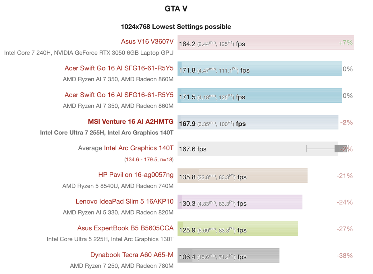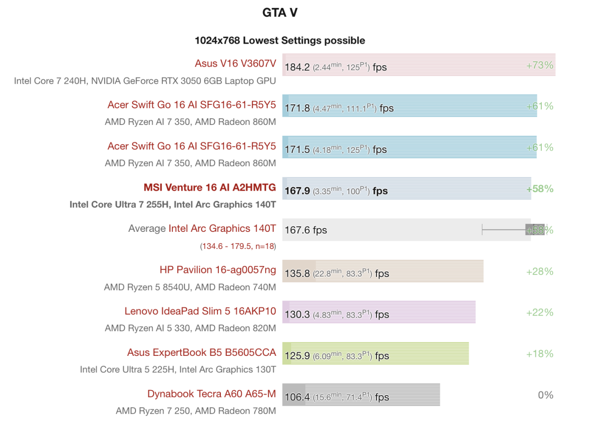 Ở tựa game nhẹ hơn như GTA V, MSI Venture 16 AI A2HMTG cho thấy hiệu năng rất tốt khi đạt khoảng 167.9 FPS ở thiết lập thấp nhất, ngang với mức trung bình của Intel Arc 140T và không quá cách biệt so với nhiều đối thủ. Kết quả này cho thấy máy hoàn toàn có thể xử lý mượt các tựa game eSports hoặc game cũ, mang lại trải nghiệm ổn định mà không cần quá nhiều tinh chỉnh về đồ họa.