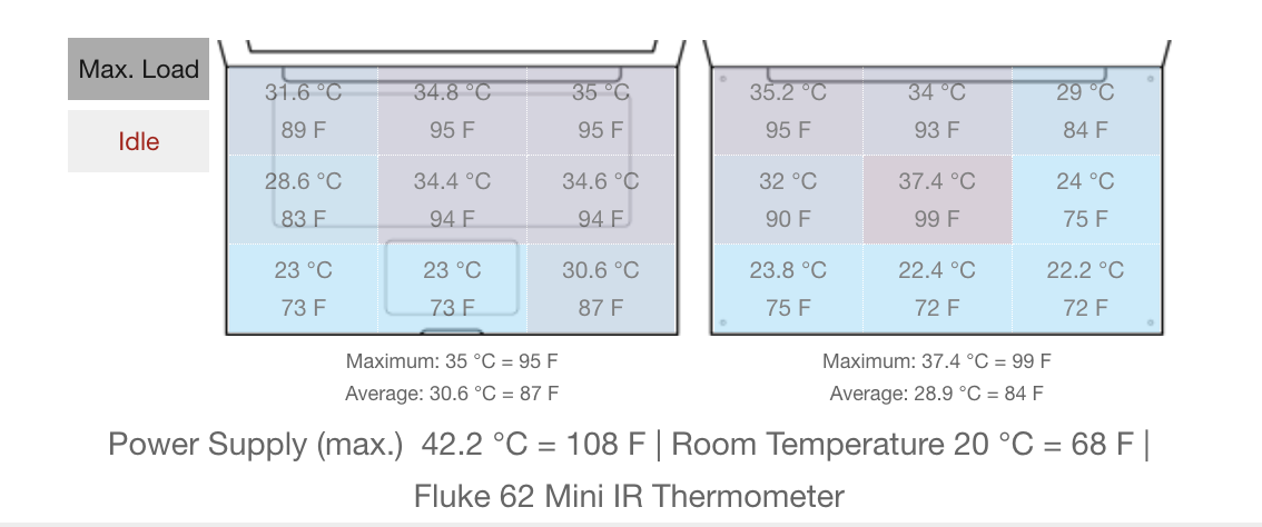 Khi hoạt động ở tải nặng, nhiệt độ tối đa ghi nhận khoảng 37.4°C, vẫn nằm trong ngưỡng an toàn và không quá nóng ở bề mặt. Điều này cho thấy hệ thống tản nhiệt hoạt động hiệu quả, đủ để duy trì hiệu năng ổn định mà không ảnh hưởng nhiều đến trải nghiệm người dùng.