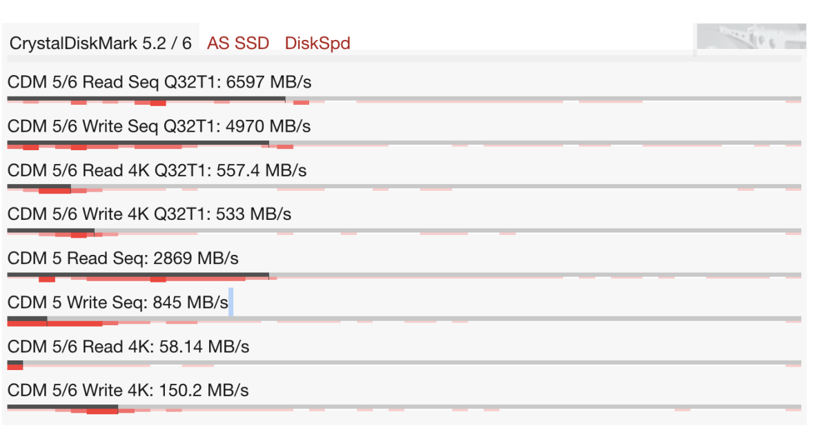Ở các tác vụ đọc ghi ngẫu nhiên (4K), tốc độ vẫn duy trì ở mức tốt, đảm bảo trải nghiệm mượt mà khi đa nhiệm hoặc làm việc với nhiều file nhỏ. Nhìn chung, SSD trên máy hoàn toàn đáp ứng tốt nhu cầu sử dụng văn phòng và cả các tác vụ nặng hơn như chỉnh sửa nội dung hoặc làm việc với dữ liệu lớn.