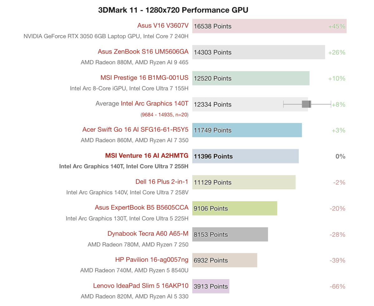 Hiệu năng GPU trên MSI Venture 16 AI A2HMTG đến từ Intel Arc Graphics 140T, một trong những iGPU mạnh hơn mặt bằng chung hiện nay. Dù không thể so sánh với GPU rời, giải pháp này vẫn hướng đến khả năng xử lý đồ họa cơ bản và hỗ trợ giải trí nhẹ.