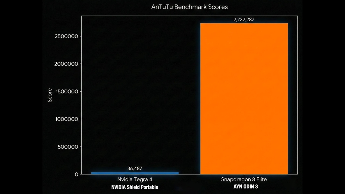 Có thể thấy điểm AnTuTu của Tegra 4 chỉ khoảng 36,487, trong khi các chip cao cấp hiện nay như Snapdragon 8 Elite có thể đạt hơn 2,700,000 điểm. Khoảng cách hiệu năng lớn này cho thấy phần cứng của Shield Portable hiện nay chỉ phù hợp với game Android nhẹ hoặc các trình giả lập hệ máy cổ điển.