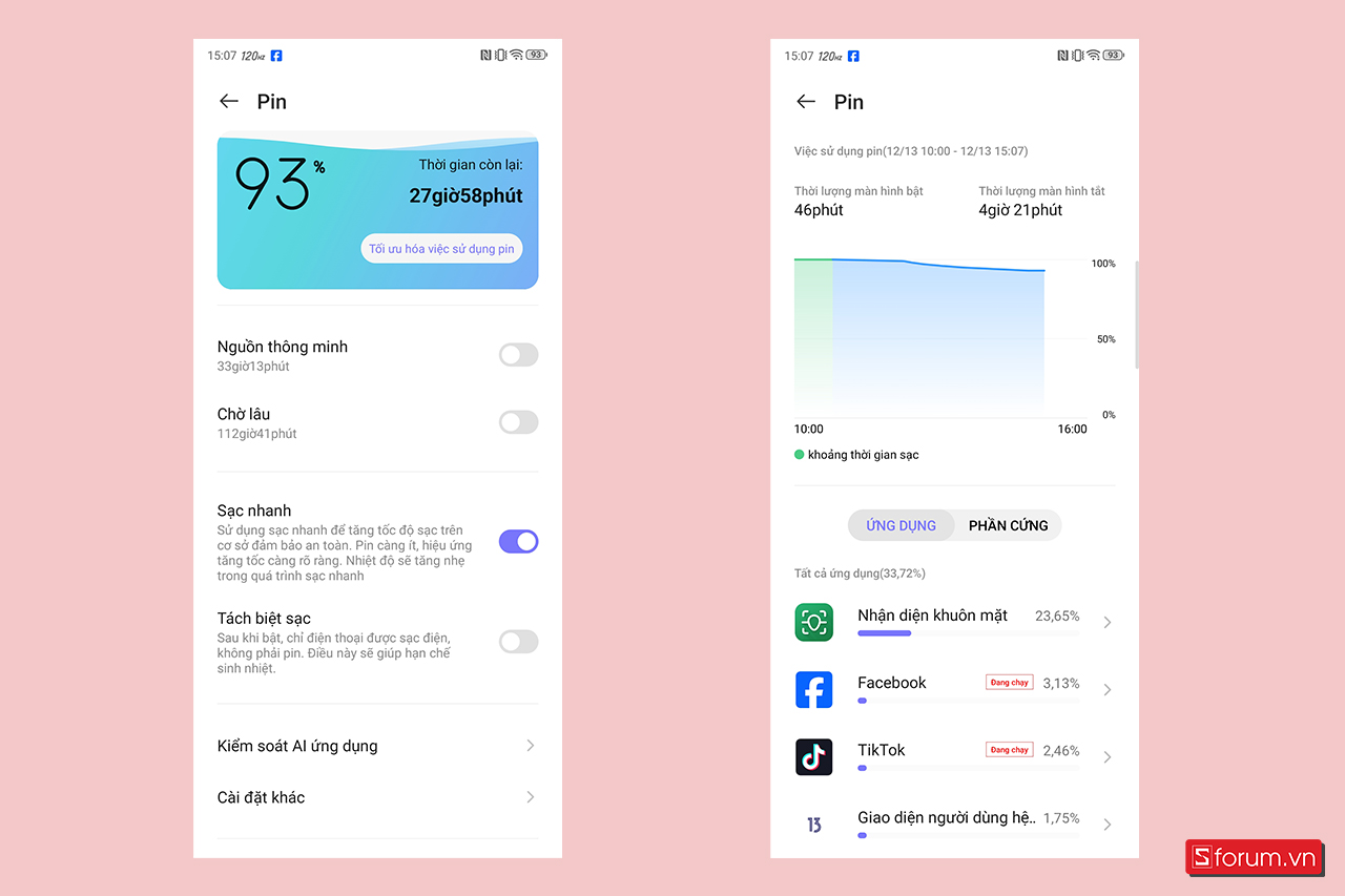 Thực sự gần đây khi đi làm mình cũng ít dùng điện thoại, thi thoảng có bật lên check tin nhắn chứ không sử dụng gì nhiều. Như bạn thấy thì đến 15 giờ chiều Red Magic 8S Pro vẫn còn 93% và đã onscreen 46 phút, trong đó mình có dùng để lướt Facebook là chính nên máy có tụt pin kha khá.
