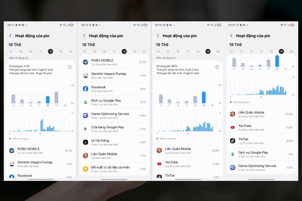 - Ngày 19/9: Sử dụng 66% pin với thời gian màn hình sáng 9 giờ 2 phút, thời gian tắt màn hình 12 giờ 37 phút