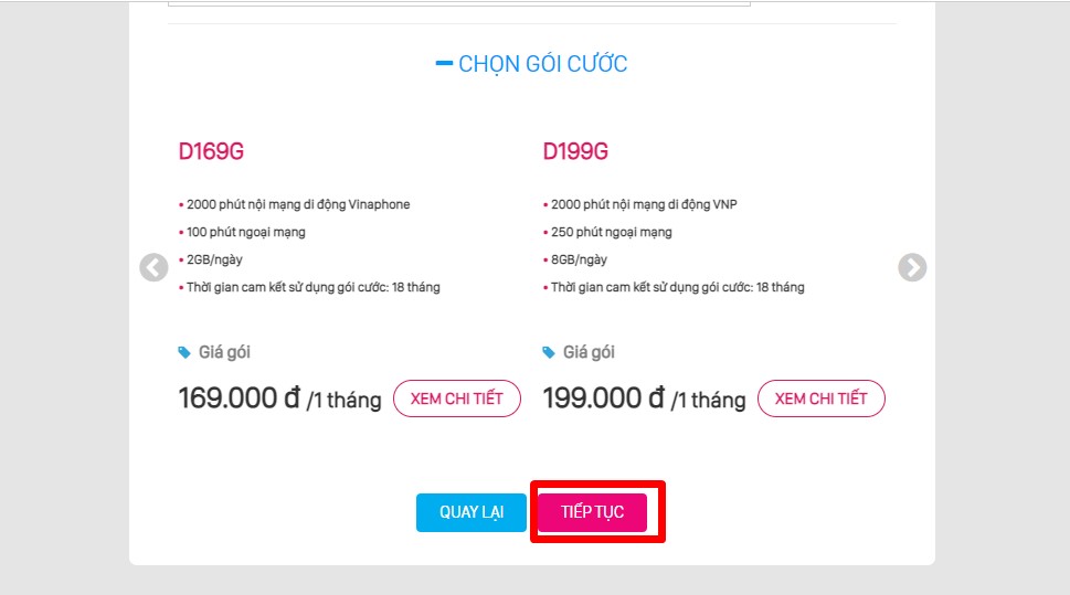 Bước 5: Lựa chọn gói cước Bấm Tiếp tục.