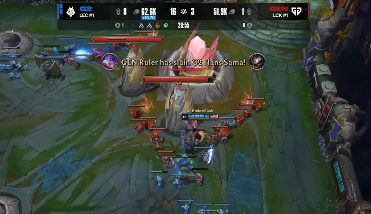 Dù Gen.G có lợi thế ở làn trên, điều đó không đủ để lật ngược tình thế. Braum của G2 thi đấu xuất sắc đến mức gần như bất khả xâm phạm — Gen.G tiêu hao toàn bộ kỹ năng vào chiếc khiên nhưng không thể hạ gục. BrokenBlade trên K'Sante cũng gây đau đầu cho đối thủ khi thoát chết trong những pha đấu đội then chốt. G2 kết thúc ván đấu ở phút thứ 22 sau khi cướp Baron, dù Gen.G đã có một màn phản kháng dữ dội ở ngay trước cổng Nexus.