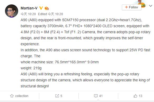 Hôm nay, nhiều thông số cấu hình được cho là của Galaxy A90 hoặc A80 đã bị rò rỉ bởi người dùng Weibo có tên Martian-V. Tuy nhiên nhiều khả năng sẽ là chiếc A90 bởi cấu hình và những tính năng được lộ diện rất cao cấp. Theo ông, sản phẩm mới của Samsung sẽ có màn hình 6.7 inch giống như Galaxy A70. Tuy nhiên, nó không có notch ở viền cạnh trên vì đã sử dụng camera pop-up. Thiết bị cũng được trang bị màn hình AMOLED với độ phân giải 2,400 x 1,080 px.